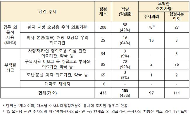 2024년 의료용 마약류 점검 현황식약처는 연간 약 1억 3천만 건의 마약류 취급 보고가 이루어지는 마약류통합관리시스템 빅데이터를 분석해 과다처방, 의료쇼핑, 부적절한 취급이 의심되는 의료기관을 선정하고, 지자체·경찰청 등 관계기관과 함께 집중 점검을 진행했다. 그 결과, ‘마약류 관리에 관한 법률’ 위반이 확인되거나 의심되는 188개소 중 97건은 수사 의뢰, 161건은 관할 지자체를 통한 행정처분이 진행됐다.
