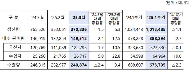 산업통상자원부는 15일 발표한 ‘2025년 1분기 자동차산업 동향’에서 지난 3월 국내 자동차 생산량이 전년 동월 대비 1.5%, 내수판매량은 2.4% 증가했다고 밝혔다. 수출은 수량 기준으로 2.4% 감소했지만, 금액 기준으로는 1.2% 늘어 62.4억 달러를 기록하며 역대 3월 기준 두 번째로 높은 실적을 나타냈다.