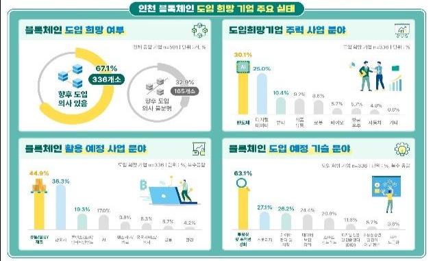 인천시는 지난 3월 `2024 인천 블록체인 산업 실태조사`를 통해 지역 기업들의 블록체인 도입 의향을 조사했다. 조사에 응답한 501개 기업 중 336개 기업(67.1%)이 도입 의사를 밝혔으며, 주요 희망 분야는 반도체(30.1%), 디지털·데이터(20.5%), 뷰티(10.4%), 식품·유통(9.2%) 등으로 나타났다.