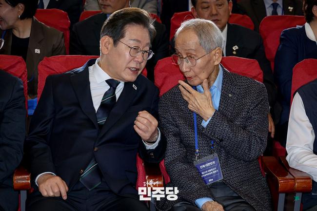 윤여준 더불어민주당 상임총괄선거대책위원장이 윤여준 더불어민주당 상임총괄선거대책위원장이 이재명 후보와 얘기를 나누고 있다.