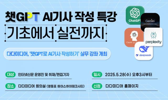 인터넷신문 솔루션 전문 기업 다다미디어가 오는 28일 인터넷신문 운영진 및 취재 · 편집 기자들을 대상으로 `생성형 AI 기사 쓰기` 실전 특강을 진행한다