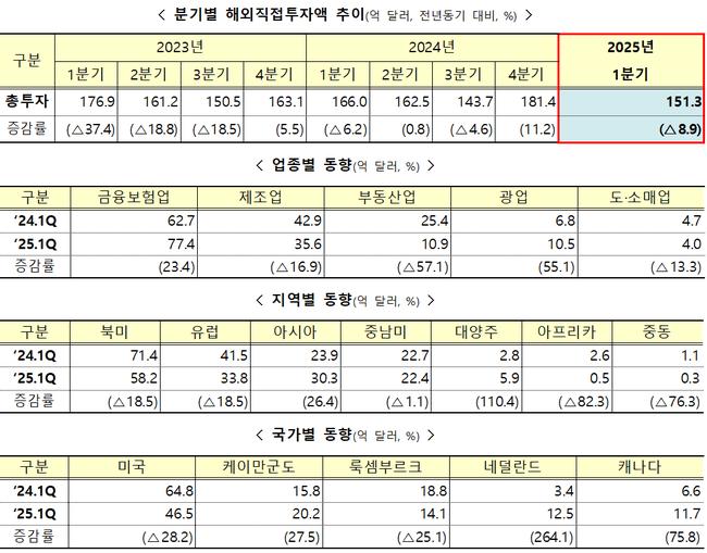 2025년 1분기 해외직접투자 151.3억 달러… 전년 대비 8.9% 감소