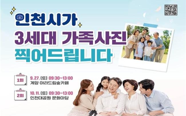 이번 행사는 9월 27일과 10월 11일 이틀에 걸쳐 각각 계양아라드림숲카페와 인천대공원 문화마당에서 열린다. 80세 이상 어르신을 포함해 인천시에 3년 이상 거주하며 3대가 함께 사는 100가족을 초청해 어르신 장수 사진과 가족 스냅사진 촬영을 지원한다.
