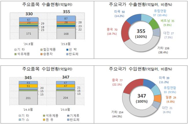 품목별로는 반도체 수출이 29.5% 증가한 87억 1,400만 달러로 큰 폭의 증가세를 보이며 전체 수출의 24.5%를 차지했다. 선박(28.9%)과 승용차(21.7%) 역시 수출 증가를 견인했다. 반면 석유제품(△3.9%), 무선통신기기(△11.6%), 자동차부품(△3.1%) 등의 수출은 감소했다.