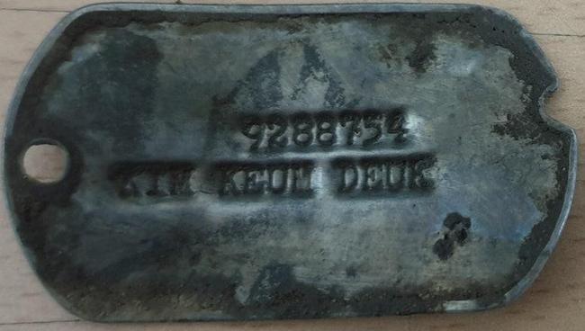 김금득 하사(현 계급 상병)의 유해와 함께 수습된 유품인 인식표에는 고인의 군번과 성명(영문)이 음각으로 새겨져 있다. (국방부 제공)