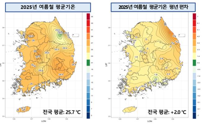 2025년 여름철 전국 평균기온 및 평년 대비 편차 분포도