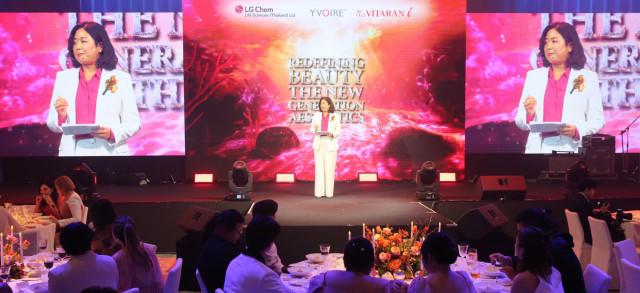 LG화학 노지혜 에스테틱사업부장이 ‘비타란’ 태국 론칭 행사에서 제품 경쟁력을 발표하고 있다