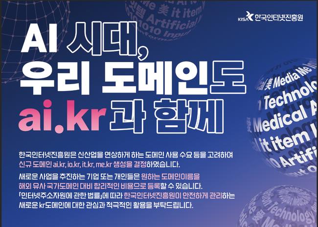 • 3단계 kr 도메인 ‘ai.kr’, ‘it.kr’, ‘io.kr’, ‘me.kr’ 신설