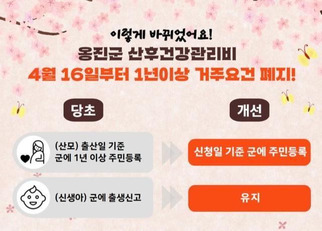 그간 옹진군 산후건강관리비 지원은 지난해 시행된 이후 1년 이상 옹진군에 거주한 산모만을 대상으로 해, 타지역에서 전입한 산모들이 혜택을 받지 못하는 아쉬움이 있었다. 그러나 이번 거주요건 폐지로 산모가 신청일 기준 옹진군에 거주하고 있으면 누구나 혜택을 받을 수 있게 됐다. 단, 신생아는 옹진군에 출생신고를 해야 하는 요건은 그대로 유지된다.