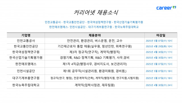 취업 포털 커리어넷이 인천교통공사, 한국교통안전공단, 한국여성정책연구원 등 8개 공공기관의 채용 소식을 24일 발표했다.