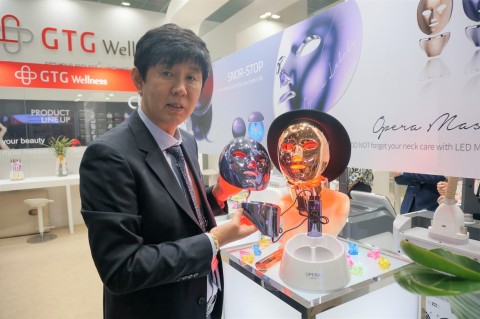 지티지웰니스의 LED마스크 오페라미룩스를 설명중인 김태현 대표