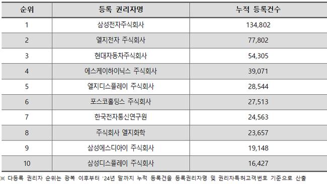 특허 분야에서 삼성전자는 13만4,802건을 등록해 전체 등록 특허의 5.0%를 차지하며 1위에 올랐다. 이어 LG전자(7만7,802건), 현대자동차(5만4,305건), SK하이닉스(3만9,071건), LG디스플레이(2만8,544건) 순으로 나타났다. 삼성전자는 반도체, 모바일 등 첨단 기술 분야를 중심으로 세계적인 특허 강자로 자리잡아 왔으며, 지난해에도 5,255건의 특허를 신규 등록했다.