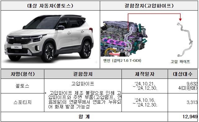 기아는 셀토스 등 2개 차종 12,949대에서 고압파이프 제조 불량으로 인한 연료 누유 가능성이 확인되어 5월 28일부터 리콜을 시행한다. 해당 결함은 고압파이프와 주변 부품의 연결부에서 연료가 누출되어 화재로 이어질 위험이 있는 것으로 확인되었다.
