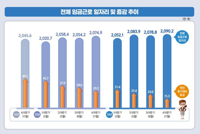 2024년 4분기 전체 임금근로 일자리는 전년 같은 기간보다 15만3천개 늘어난 2,090만2천개로 집계됐으며, 보건·사회복지와 여성 및 고령층 고용 증가가 주요 요인으로 나타났다.