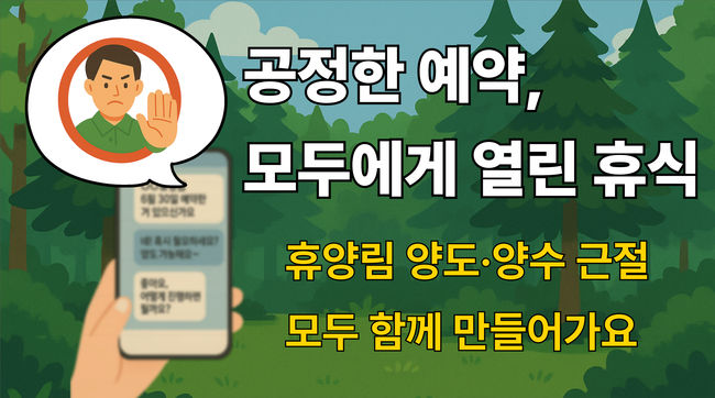 산림청 국립자연휴양림관리소가 7일부터 포털사이트 네이버와 협력해 휴양림 예약사항의 양도·양수 금지 제도를 홍보하며, 불공정 예약을 예방하고 공정한 이용문화 확산에 나섰다.