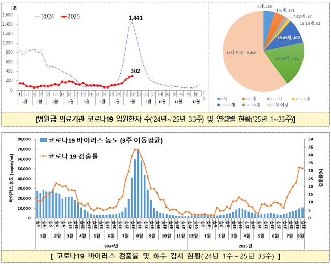 질병관리청에 따르면 2025년 33주차(8월 10~16일) 병원급 표본감시 의료기관의 코로나19 입원환자 수는 302명으로 집계됐다. 이는 26주차(6월 22~28일) 63명에서 7주 연속 늘어난 수치로, 한 달 새 두 배 이상 증가했다.