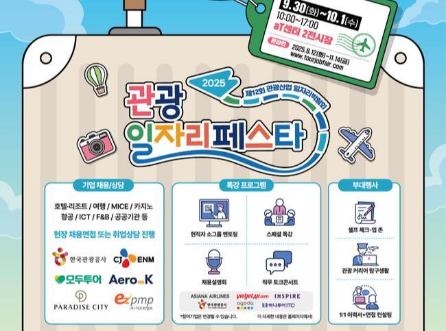문화체육관광부와 한국관광공사가 9월 30일부터 10월 1일까지 서울 서초구 aT센터에서 ‘2025 관광 일자리페스타’를 개최하며, 여행사·호텔·마이스 기업·관광벤처 등 130여 개 기업이 참가해 구직자와의 연결을 지원한다.