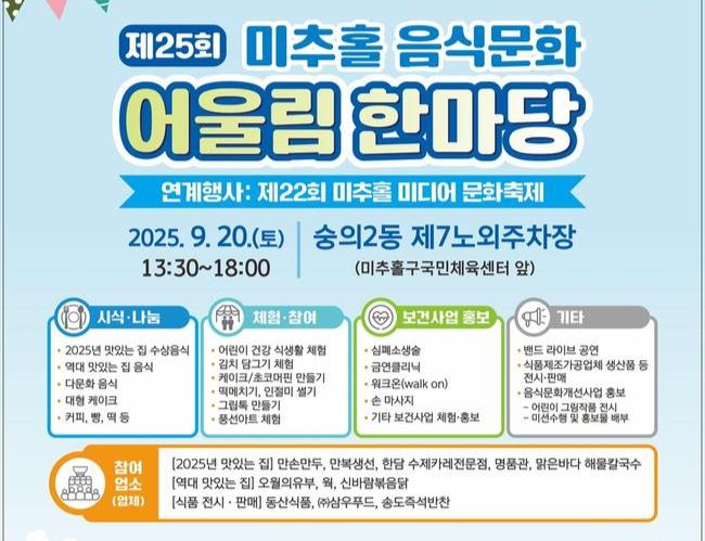 인천 미추홀구(구청장 이영훈)는 오는 20일 숭의2동 제7노외주차장(미추홀구국민체육센터 앞)에서 `제25회 미추홀 음식문화 어울림 한마당`을 개최한다.
