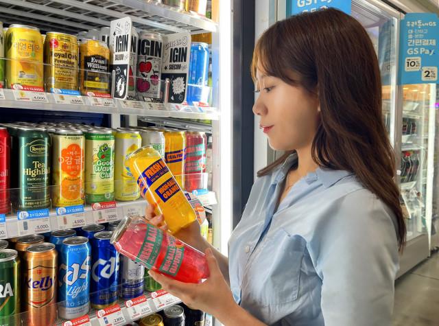 GS25에서 모델이 투명 하이볼 프레시볼 2종을 살펴보고 있다