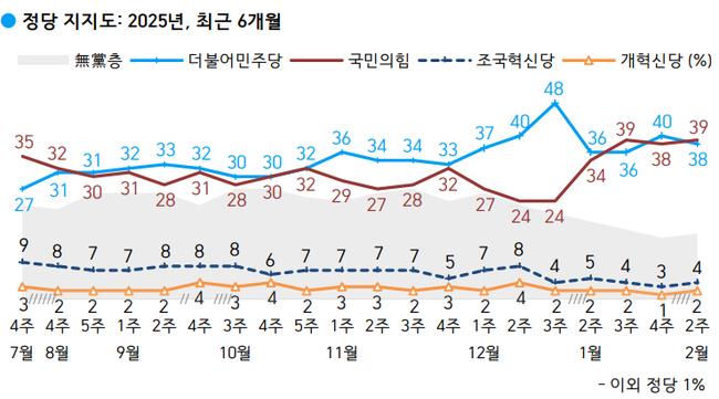 한국갤럽이 2025년 2월 11~13일 전국 만 18세 이상 유권자 1,004명을 대상으로 실시한 여론조사 결과, 정당 지지도는 국민의힘 39%, 더불어민주당 38%로 초접전 양상을 보였다.
