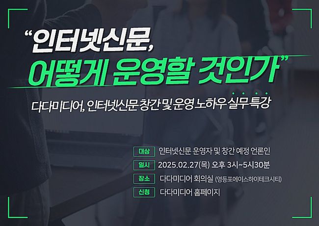 다다미디어는 오는 2월 27일(목) 인터넷신문 운영자 및 창간 예정 언론인을 대상으로 ‘인터넷신문, 어떻게 운영할 것인가’라는 주제의 인터넷신문 운영 및 창간 등록 실무 강좌를 개최한다.