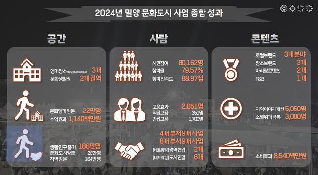 특히 밀양시는 제3차 문화도시 지정 이후 ‘삶의 회복 새로운 미래, 햇살문화도시 밀양’ 비전 아래, 폐교된 (구)밀양대학교 부지를 ‘햇살문화캠퍼스’로 재탄생시키는 등 눈에 띄는 성과를 냈다. 밀양대 페스타에는 약 3만 명이, 햇살문화캠퍼스 내 복합문화공간에는 2달간 14만 명이 방문하며 지역 문화 활성화와 경제효과 창출에 기여했다.